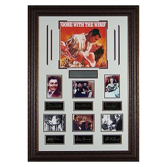 Brilliantly colored reproduction of the original 1939 movie poster. Cast photographs accompany the engraved signatures. Solid brown leather-like frame with gold accents. Expertly double matted. Handsomely engraved title placard. This Gone with the Wind Engraved Signature Collage is certain to be the centerpiece of any home theater. The collage features the engraved signature reproductions of Clark Gable, Vivien Leigh, Olivia de Havilland, Butterfly McQueen, Leslie Howard, and Hattie McDaniel.. . . . . Made in USA.